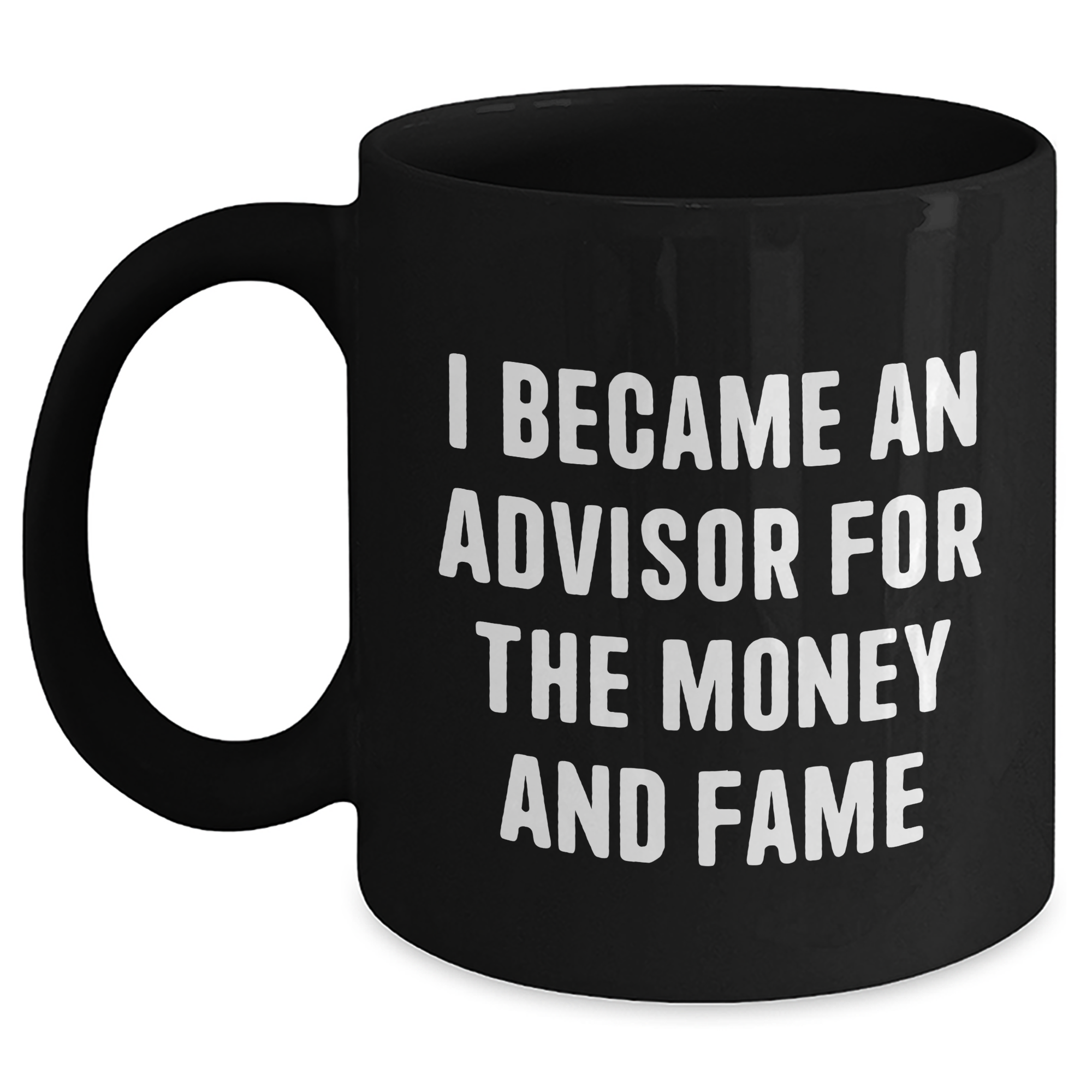 Funny Advisor Gifts: 'I Became An Advisor For The Money And Fame' Black Coffee Mug, Gifts from Men to Advisors, Mother's Day Unique Gifts Select your color Black Select your size 11oz 15oz Decrease quantity for Funny Advisor Gifts: 'I Became An Advisor For The Money And Fame' Black Coffee Mug, Gifts from Men to Advisors, Mother's Day Unique Gifts Quantity Increase quantity Show product Select color Removing from cart... Adding... Out of stock Unavailable Add to cart Removing from cart... Adding... Already in cart Select another option From $17.99 USD Unit price / per