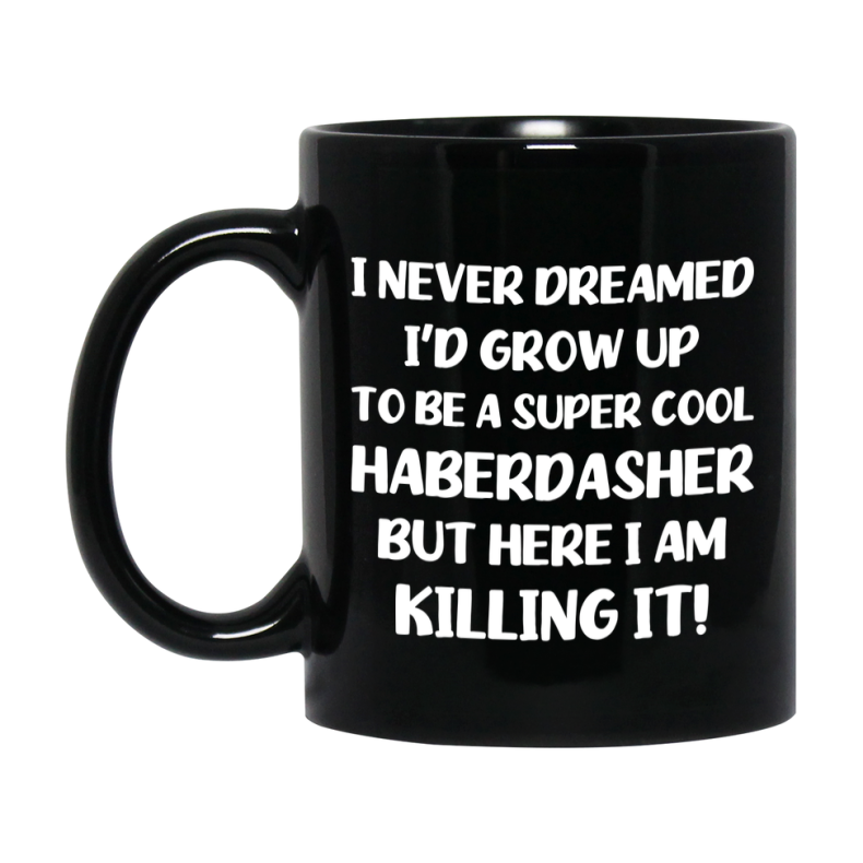 Funny Haberdasher Black Mug - "I Never Dreamed I'd Grow Up To Be A Super Cool Haberdasher" - 11Oz Or 15Oz Ceramic Coffee Cup Select your size 11oz 15oz Select your color Black Decrease quantity for Funny Haberdasher Black Mug - "I Never Dreamed I'd Grow Up To Be A Super Cool Haberdasher" - 11Oz Or 15Oz Ceramic Coffee Cup Quantity Increase quantity Show product Select size Removing from cart... Adding... Out of stock Unavailable Add to cart Removing from cart... Adding... Already in cart Select another option From $16.95 USD Unit price / per