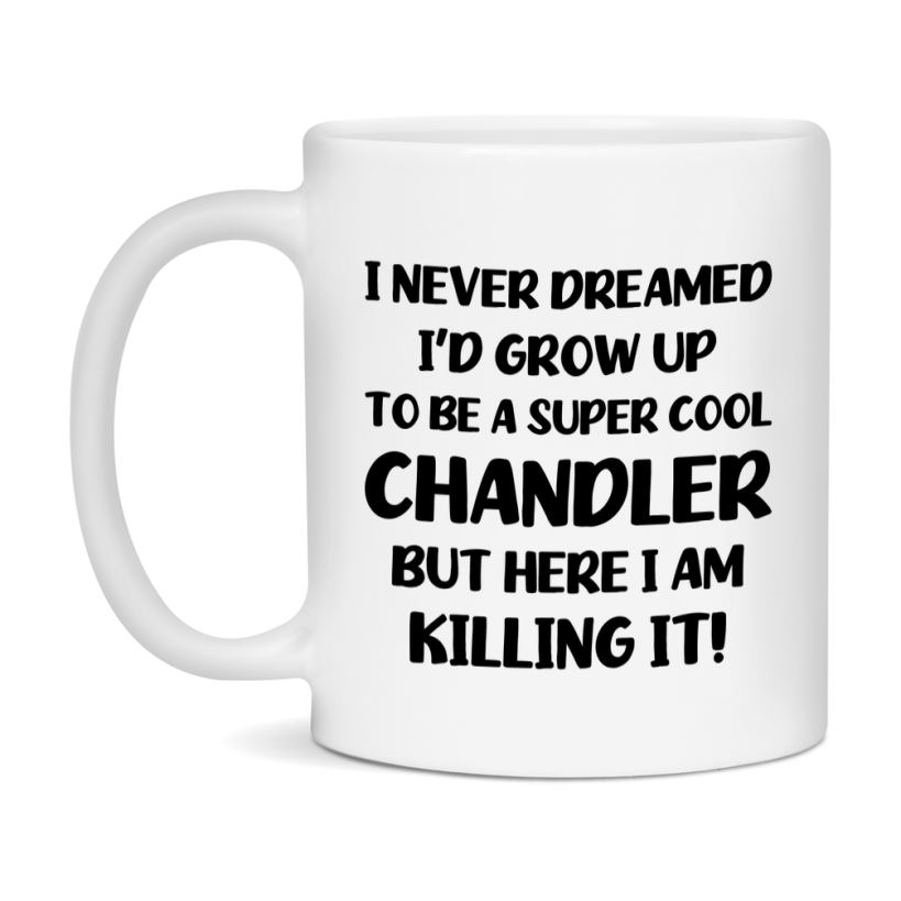 Funny Chandler Mug - "I Never Dreamed I'd Grow Up To Be A Super Cool Chandler" - 11Oz Or 15Oz Ceramic Coffee Cup Select your size 11oz 15oz Select your color White White/Red White/Pink White/Orange White/Light Green White/Light Blue White/Midnight Blue White/Black Decrease quantity for Funny Chandler Mug - "I Never Dreamed I'd Grow Up To Be A Super Cool Chandler" - 11Oz Or 15Oz Ceramic Coffee Cup Quantity Increase quantity Show product Select size Removing from cart... Adding... Out of stock Unavailable Add to cart Removing from cart... Adding... Already in cart Select another option From $16.95 USD Unit price / per