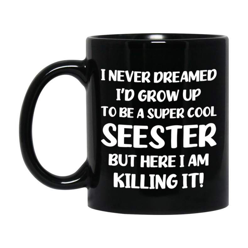 Funny Seester Black Mug - "I Never Dreamed I'd Grow Up To Be A Super Cool Seester" - 11Oz Or 15Oz Ceramic Coffee Cup Select your size 11oz 15oz Select your color Black Decrease quantity for Funny Seester Black Mug - "I Never Dreamed I'd Grow Up To Be A Super Cool Seester" - 11Oz Or 15Oz Ceramic Coffee Cup Quantity Increase quantity Show product Select size Removing from cart... Adding... Out of stock Unavailable Add to cart Removing from cart... Adding... Already in cart Select another option From $16.95 USD Unit price / per