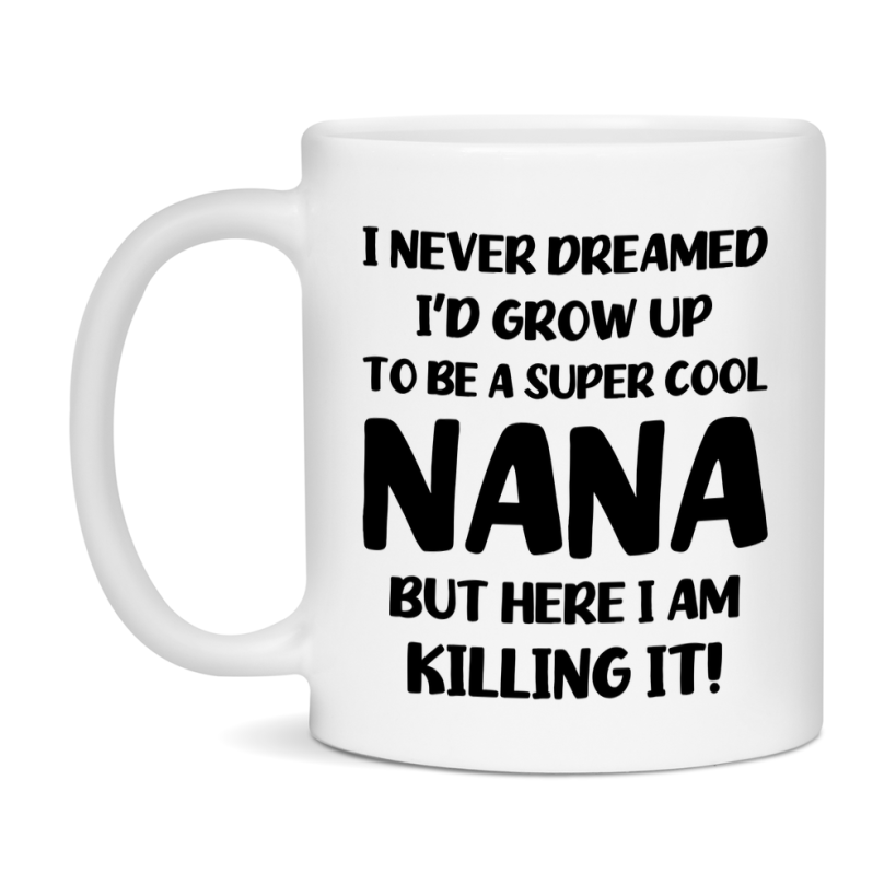 Funny Nana Mug - "I Never Dreamed I'd Grow Up To Be A Super Cool Nana" - White Ceramic Coffee Cup (11Oz Or 15Oz Select your size 11oz 15oz Select your color White White/Red White/Pink White/Orange White/Light Green White/Light Blue White/Midnight Blue White/Black Decrease quantity for Funny Nana Mug - "I Never Dreamed I'd Grow Up To Be A Super Cool Nana" - White Ceramic Coffee Cup (11Oz Or 15Oz Quantity Increase quantity Show product Select size Removing from cart... Adding... Out of stock Unavailable Add to cart Removing from cart... Adding... Already in cart Select another option From $16.95 USD Unit price / per