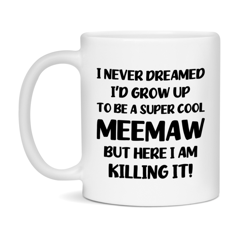Funny Meemaw Mug - "I Never Dreamed I'd Grow Up To Be A Super Cool Meemaw" - White Ceramic Coffee Cup (11Oz Or 15Oz Select your size 11oz 15oz Select your color White White/Red White/Pink White/Orange White/Light Green White/Light Blue White/Midnight Blue White/Black Decrease quantity for Funny Meemaw Mug - "I Never Dreamed I'd Grow Up To Be A Super Cool Meemaw" - White Ceramic Coffee Cup (11Oz Or 15Oz Quantity Increase quantity Show product Select size Removing from cart... Adding... Out of stock Unavailable Add to cart Removing from cart... Adding... Already in cart Select another option From $16.95 USD Unit price / per