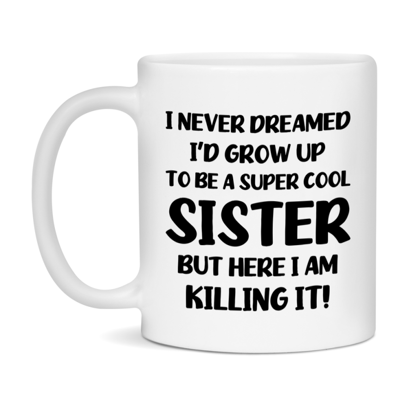 Funny Sister Mug - "I Never Dreamed I'd Grow Up To Be A Super Cool Sister" - White Ceramic Coffee Cup (11Oz Or 15Oz Select your size 11oz 15oz Select your color White White/Red White/Pink White/Orange White/Light Green White/Light Blue White/Midnight Blue White/Black Decrease quantity for Funny Sister Mug - "I Never Dreamed I'd Grow Up To Be A Super Cool Sister" - White Ceramic Coffee Cup (11Oz Or 15Oz Quantity Increase quantity Show product Select size Removing from cart... Adding... Out of stock Unavailable Add to cart Removing from cart... Adding... Already in cart Select another option From $16.95 USD Unit price / per