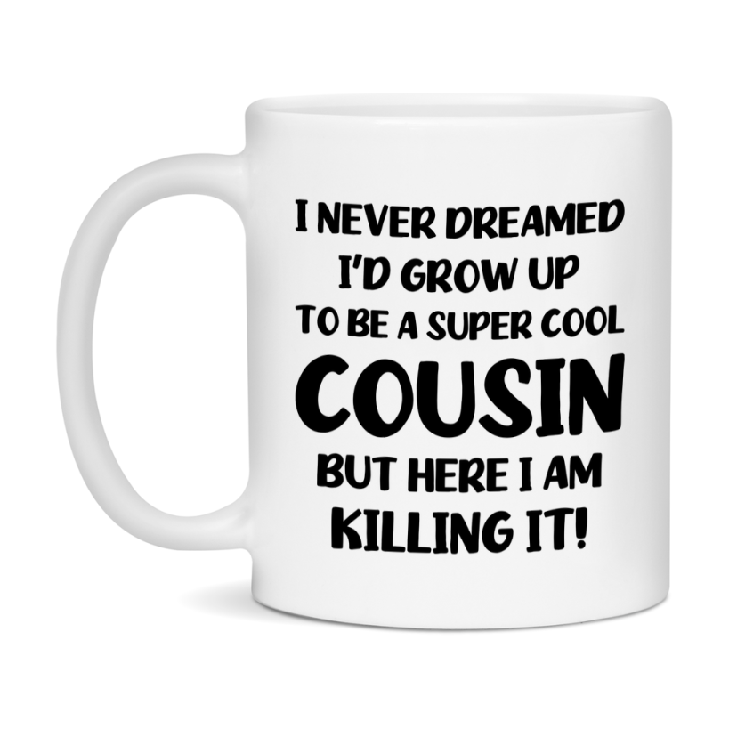 Funny Cousin Mug - "I Never Dreamed I'd Grow Up To Be A Super Cool Cousin" - White Ceramic Coffee Cup (11Oz Or 15Oz Select your size 11oz 15oz Select your color White White/Red White/Pink White/Orange White/Light Green White/Light Blue White/Midnight Blue White/Black Decrease quantity for Funny Cousin Mug - "I Never Dreamed I'd Grow Up To Be A Super Cool Cousin" - White Ceramic Coffee Cup (11Oz Or 15Oz Quantity Increase quantity Show product Select size Removing from cart... Adding... Out of stock Unavailable Add to cart Removing from cart... Adding... Already in cart Select another option From $16.95 USD Unit price / per