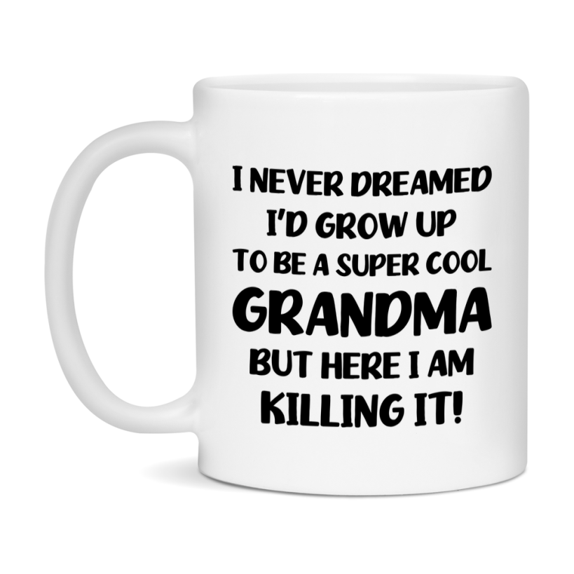 Funny Grandma Mug - "I Never Dreamed I'd Grow Up To Be A Super Cool Grandma" - White Ceramic Coffee Cup (11Oz Or 15Oz Select your size 11oz 15oz Select your color White White/Red White/Pink White/Orange White/Light Green White/Light Blue White/Midnight Blue White/Black Decrease quantity for Funny Grandma Mug - "I Never Dreamed I'd Grow Up To Be A Super Cool Grandma" - White Ceramic Coffee Cup (11Oz Or 15Oz Quantity Increase quantity Show product Select size Removing from cart... Adding... Out of stock Unavailable Add to cart Removing from cart... Adding... Already in cart Select another option From $16.95 USD Unit price / per