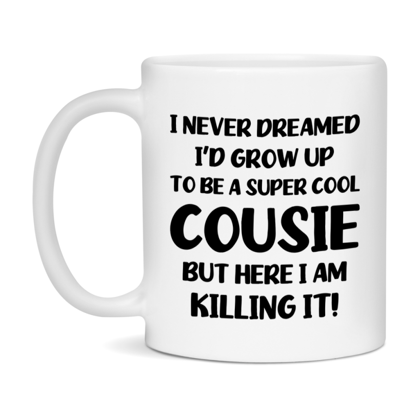Funny Cousie Mug - "I Never Dreamed I'd Grow Up To Be A Super Cool Cousie" - White Ceramic Coffee Cup (11Oz Or 15Oz Select your size 11oz 15oz Select your color White White/Red White/Pink White/Orange White/Light Green White/Light Blue White/Midnight Blue White/Black Decrease quantity for Funny Cousie Mug - "I Never Dreamed I'd Grow Up To Be A Super Cool Cousie" - White Ceramic Coffee Cup (11Oz Or 15Oz Quantity Increase quantity Show product Select size Removing from cart... Adding... Out of stock Unavailable Add to cart Removing from cart... Adding... Already in cart Select another option From $16.95 USD Unit price / per