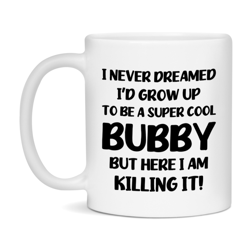 Funny Bubby Mug - "I Never Dreamed I'd Grow Up To Be A Super Cool Bubby" - White Ceramic Coffee Cup (11Oz Or 15Oz Select your size 11oz 15oz Select your color White White/Red White/Pink White/Orange White/Light Green White/Light Blue White/Midnight Blue White/Black Decrease quantity for Funny Bubby Mug - "I Never Dreamed I'd Grow Up To Be A Super Cool Bubby" - White Ceramic Coffee Cup (11Oz Or 15Oz Quantity Increase quantity Show product Select size Removing from cart... Adding... Out of stock Unavailable Add to cart Removing from cart... Adding... Already in cart Select another option From $16.95 USD Unit price / per