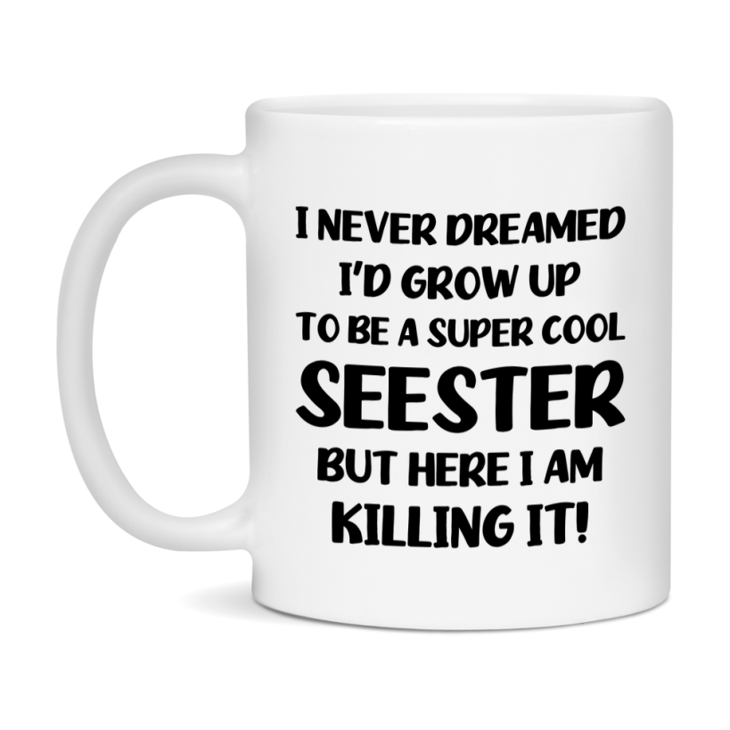 Funny Seester Mug - "I Never Dreamed I'd Grow Up To Be A Super Cool Seester" - White Ceramic Coffee Cup (11Oz Or 15Oz Select your size 11oz 15oz Select your color White White/Red White/Pink White/Orange White/Light Green White/Light Blue White/Midnight Blue White/Black Decrease quantity for Funny Seester Mug - "I Never Dreamed I'd Grow Up To Be A Super Cool Seester" - White Ceramic Coffee Cup (11Oz Or 15Oz Quantity Increase quantity Show product Select size Removing from cart... Adding... Out of stock Unavailable Add to cart Removing from cart... Adding... Already in cart Select another option From $16.95 USD Unit price / per