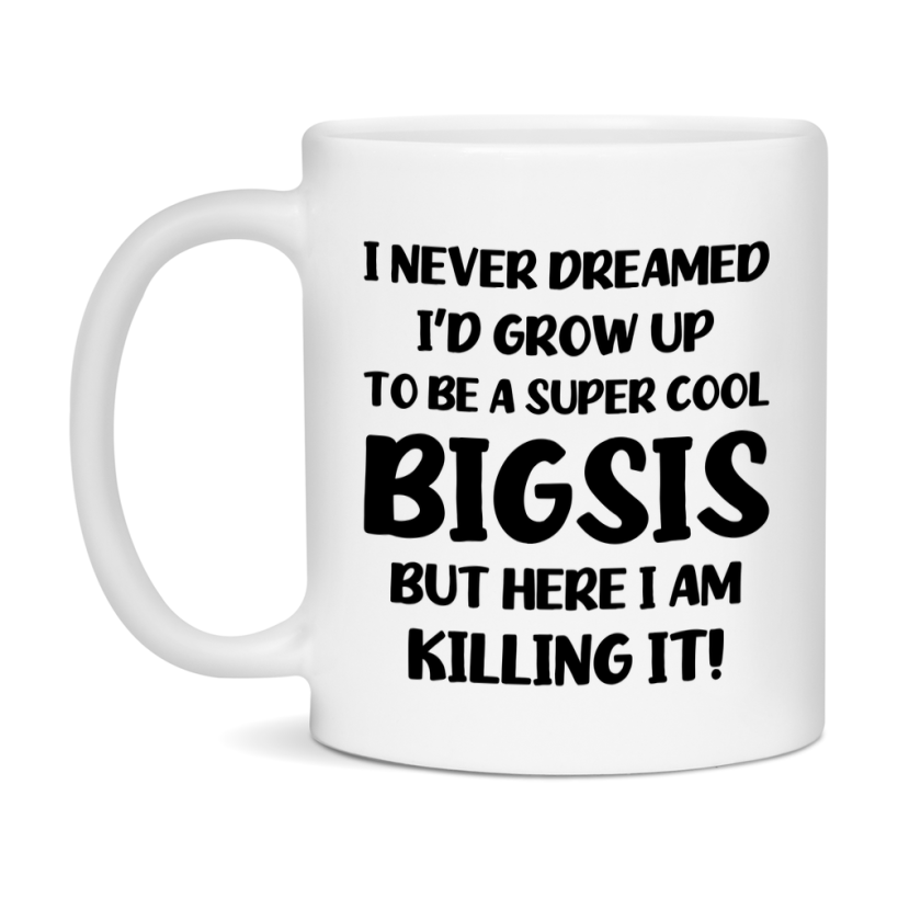 Funny Bigsis Mug - "I Never Dreamed I'd Grow Up To Be A Super Cool Bigsis" - White Ceramic Coffee Cup (11Oz Or 15Oz Select your size 11oz 15oz Select your color White White/Red White/Pink White/Orange White/Light Green White/Light Blue White/Midnight Blue White/Black Decrease quantity for Funny Bigsis Mug - "I Never Dreamed I'd Grow Up To Be A Super Cool Bigsis" - White Ceramic Coffee Cup (11Oz Or 15Oz Quantity Increase quantity Show product Select size Removing from cart... Adding... Out of stock Unavailable Add to cart Removing from cart... Adding... Already in cart Select another option From $16.95 USD Unit price / per