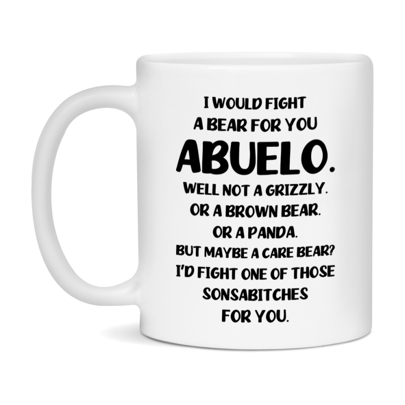 -7% OFF Funny Mug For Abuelo, I Would Fight A Bear For You Abuelo, Double-Sided 11Oz Or 15Oz Ceramic Coffee Cup Select your size 11oz 15oz Select your color White White/Red White/Pink White/Orange White/Light Green White/Light Blue White/Midnight Blue White/Black Decrease quantity for Funny Mug For Abuelo, I Would Fight A Bear For You Abuelo, Double-Sided 11Oz Or 15Oz Ceramic Coffee Cup Quantity Increase quantity Show product Select size Removing from cart... Adding... Out of stock Unavailable Add to cart Removing from cart... Adding... Already in cart Select another option Sale price $12.00 USD $12.95 USD Unit price / per