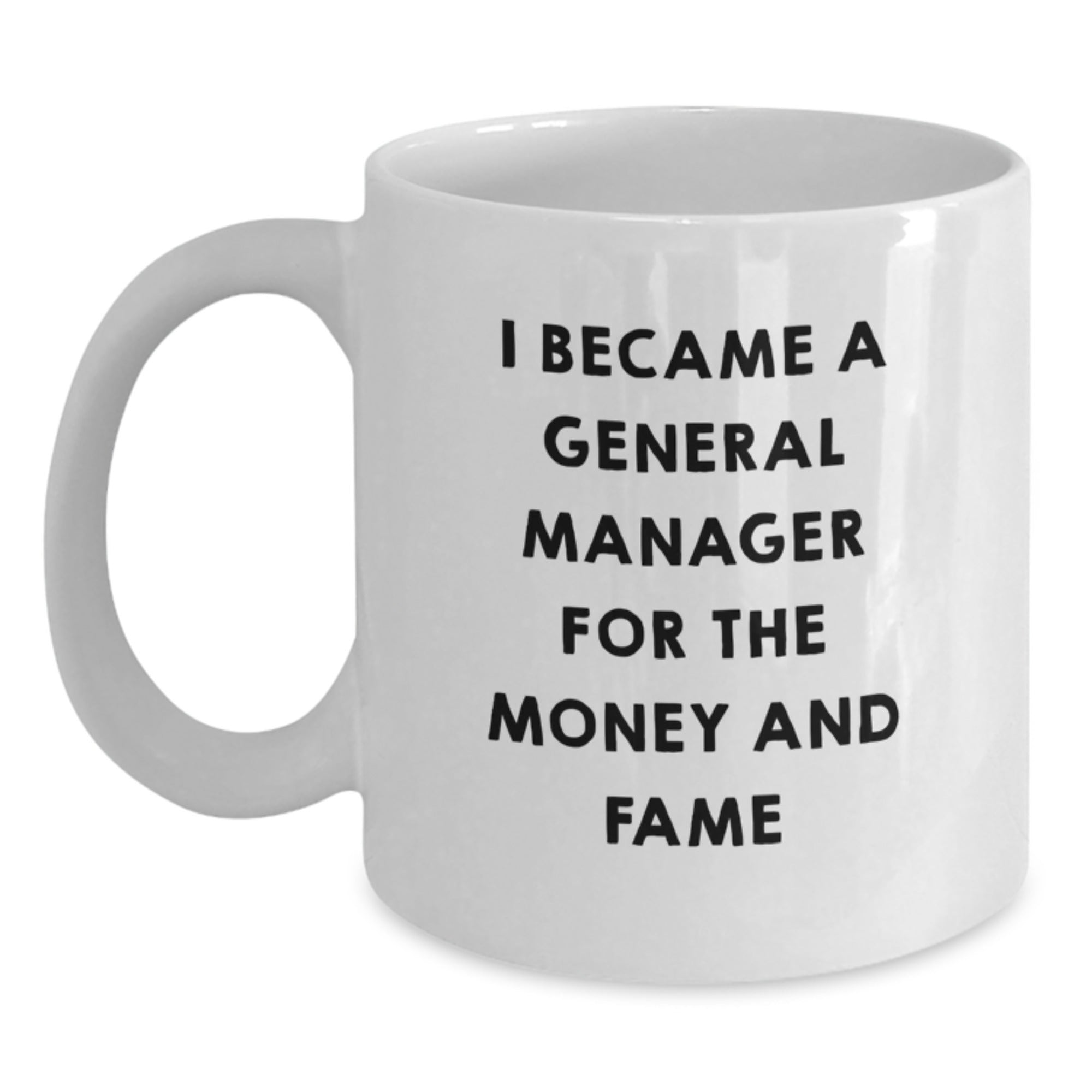 Funny General Manager Gifts for Men, 'I Became A General Manager For The Money And Fame' White Coffee Mug, Gifts from Friends to General Manager, Christmas Unique Gift Select your color White Select your size 11oz 15oz Decrease quantity for Funny General Manager Gifts for Men, 'I Became A General Manager For The Money And Fame' White Coffee Mug, Gifts from Friends to General Manager, Christmas Unique Gift Quantity Increase quantity Show product Select color Removing from cart... Adding... Out of stock Unavailable Add to cart Removing from cart... Adding... Already in cart Select another option From $14.95 USD Unit price / per