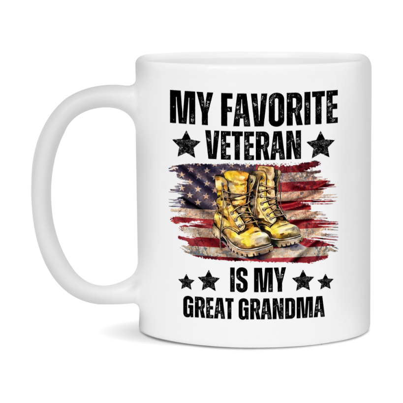 Veteran Gift Mug, My Favorite Veteran Is My Great Grandma, 11oz or 15oz Ceramic Coffee Cup Gift for Great Grandma Select your size 11oz 15oz Select your color White White/Red White/Pink White/Orange White/Light Green White/Light Blue White/Midnight Blue White/Black Decrease quantity for Veteran Gift Mug, My Favorite Veteran Is My Great Grandma, 11oz or 15oz Ceramic Coffee Cup Gift for Great Grandma Quantity Increase quantity Show product Select size Removing from cart... Adding... Out of stock Unavailable Add to cart Removing from cart... Adding... Already in cart Select another option Regular price $15.00 USD Unit price / per