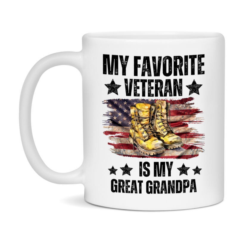 Veteran Gift Mug, My Favorite Veteran Is My Great Grandpa, 11oz or 15oz Ceramic Coffee Cup Gift for Great Grandpa Select your size 11oz 15oz Select your color White White/Red White/Pink White/Orange White/Light Green White/Light Blue White/Midnight Blue White/Black Decrease quantity for Veteran Gift Mug, My Favorite Veteran Is My Great Grandpa, 11oz or 15oz Ceramic Coffee Cup Gift for Great Grandpa Quantity Increase quantity Show product Select size Removing from cart... Adding... Out of stock Unavailable Add to cart Removing from cart... Adding... Already in cart Select another option Regular price $15.00 USD Unit price / per