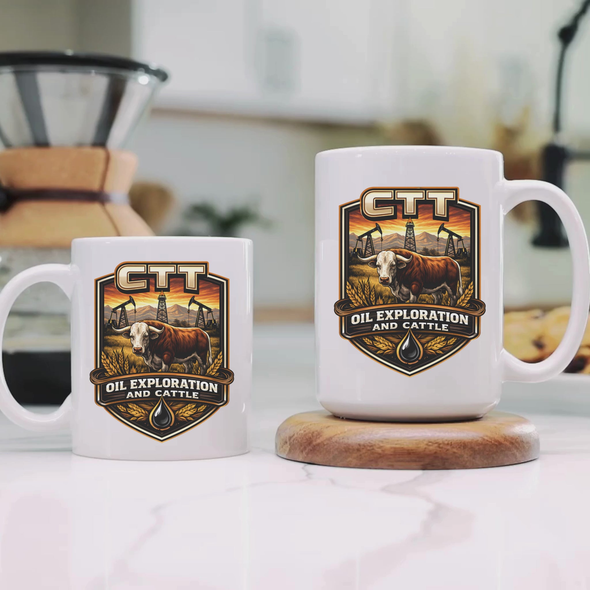 Inspired by gritty oilfield TV dramas, the CTT Oil Exploration and Cattle Mug is perfect for fans of landman culture and oilfield life. Available in 11oz or 15oz, this ceramic mug features a bold double-sided design and is microwave and dishwasher safe—built for early mornings and long days.