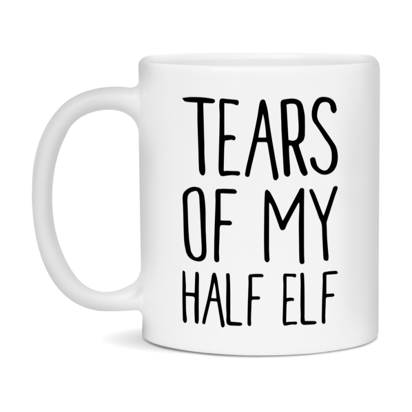 Fuel your next campaign with the DnD Dragon Masters Tears of My HALF ELF Mug. This ceramic coffee mug is available in 11oz or 15oz sizes and designed for Dungeons and Dragons players and RPG fans. Dishwasher and microwave safe, it’s the perfect game night mug or gift for any tabletop gamer.