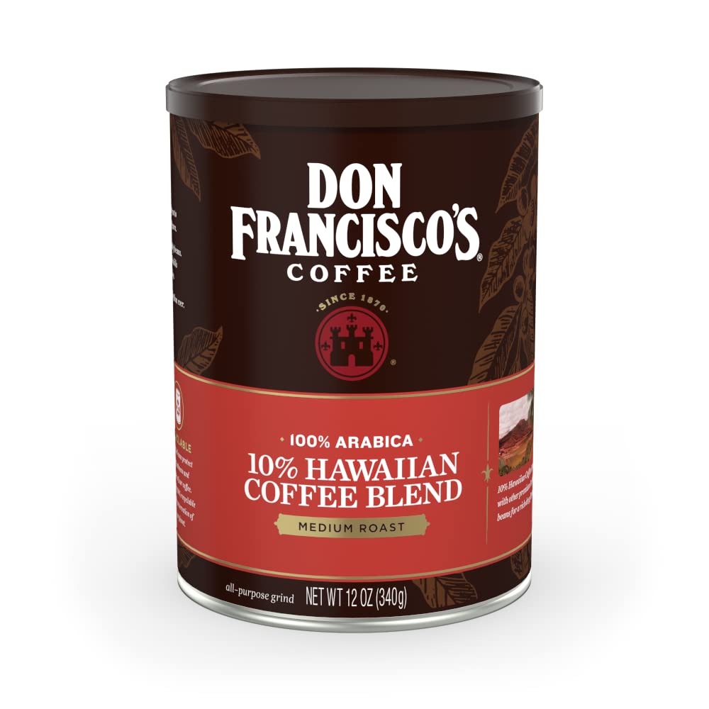 Details: Discover the rich, bold flavor of Don Francisco's Hawaiian Blend Premium Ground Coffee, a unique blend that brings the taste of the Hawaiian Islands to your cup. Our expertly crafted coffee combines 10% premium Hawaiian coffee with other high-quality Arabica beans, resulting in an exceptional brewing experience with delicate floral aromas and subtle fruity notes. Don Francisco's Coffee has been a family tradition since 1870, with four generations of expertise guiding our commitment to sourcing the world's finest coffee beans and roasting them to perfection. We oversee every step of the process with great care, from farm to cup, ensuring premium quality in every brew. One 12 oz can of our Hawaiian blend, perfect for daily use or as a gift for coffee enthusiasts. The medium grind is versatile, suitable for various brewing methods including drip coffee makers, French press, and pour-over. We're committed to sustainability, packaging our coffee in recyclable steel cans that protect freshness while contributing to environmental preservation. This aligns with our goal of providing premium coffee with a greener footprint. For the best flavor, store in a cool, dry place and consume within two weeks of opening. Brew using 2 tablespoons of ground coffee per 6 oz of cold, filtered water, adjusting to taste. Experience the legacy of Don Francisco's Coffee with every sip of our Hawaiian Blend. It's more than just coffee; it's a culmination of our expertise and devotion to delivering the perfect cup. Whether you're starting your day or sharing a moment with friends, our Hawaiian Blend Ground Coffee promises to elevate your coffee experience with its premium quality and rich, satisfying flavor. Indulge in the Don Francisco's difference and make every coffee moment special.