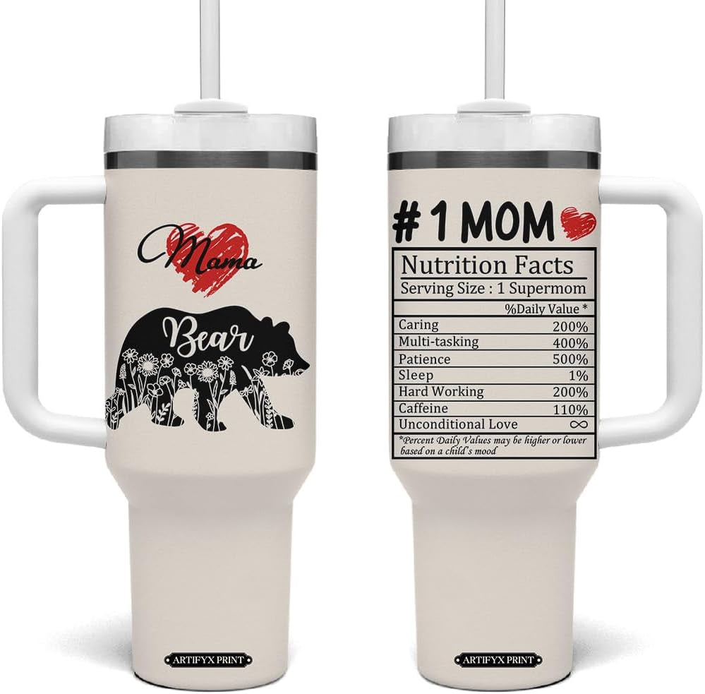 Mama Bear Tumbler with Handle - #1 Mom Nutrition Facts, Best Mom Ever Floral Bear Mother’S Day Gift from Daughter Son Husband, Christmas Gifts for Women